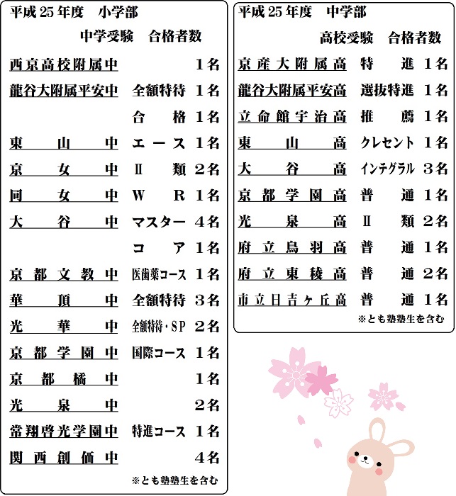 京都橘高(国公立特進、英数特進)、京都文教高(特進A)、光泉高(3類人文)、比叡山高(2類)、